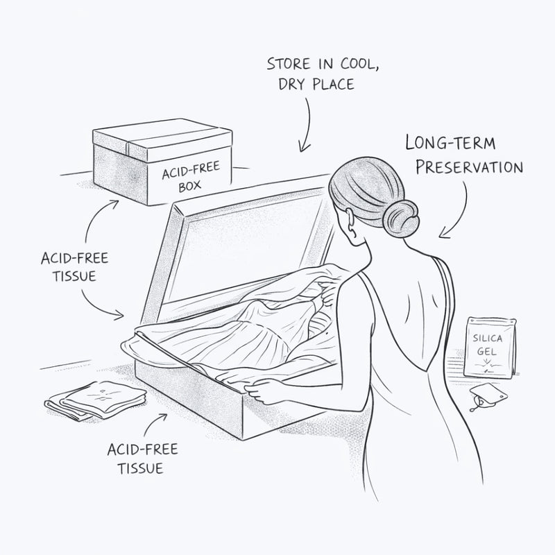 Store it in an acid-free archival box with acid-free tissue paper. Keep it in a cool, dry, dark place. Avoid plastic garment bags or regular cardboard boxes.