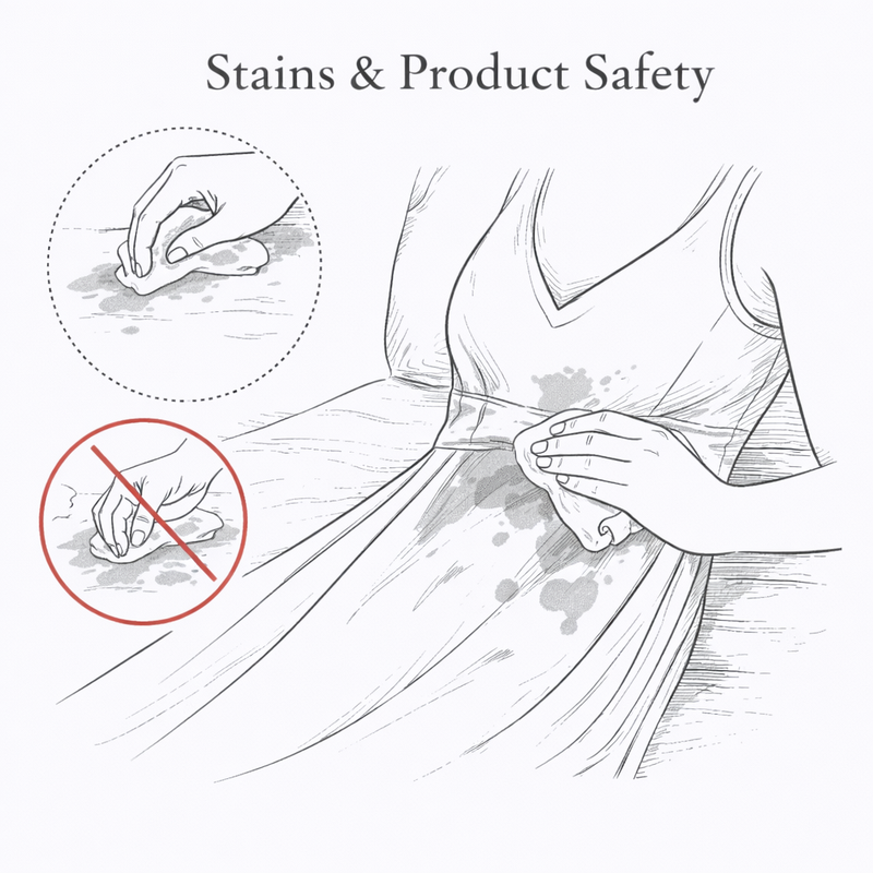 If an accidental spill happens, stay calm and act quickly. Silk is highly absorbent, so gentle and immediate care can significantly reduce the risk of permanent staining.