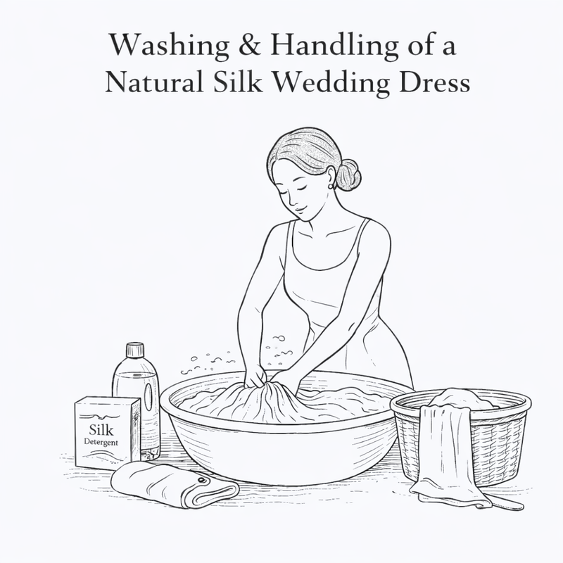 We strongly recommend professional cleaning by a specialist experienced in delicate silk bridal gowns. Natural silk requires expert handling to preserve its texture, structure, and luminosity.