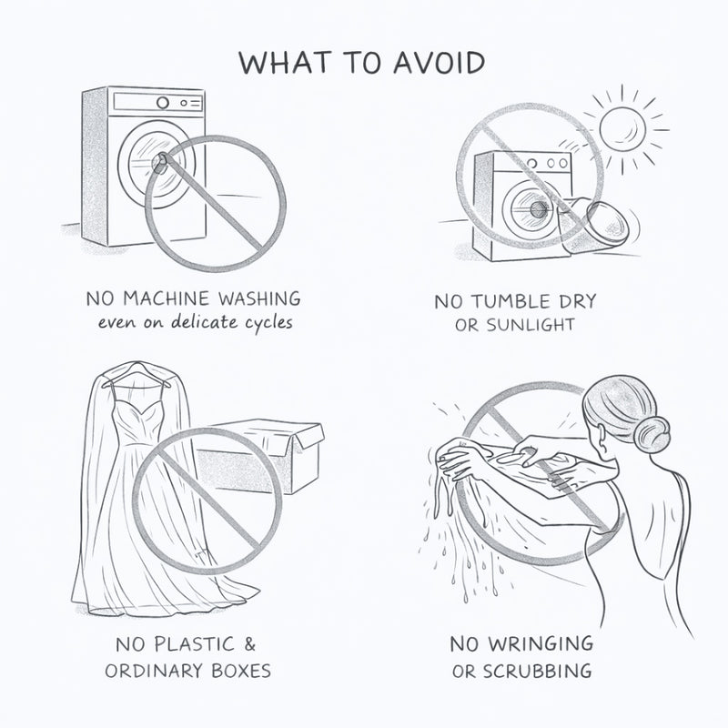 Silk is a luxurious yet highly delicate fabric. Improper care can cause irreversible damage, so it’s important to avoid these common mistakes when handling your wedding dress: