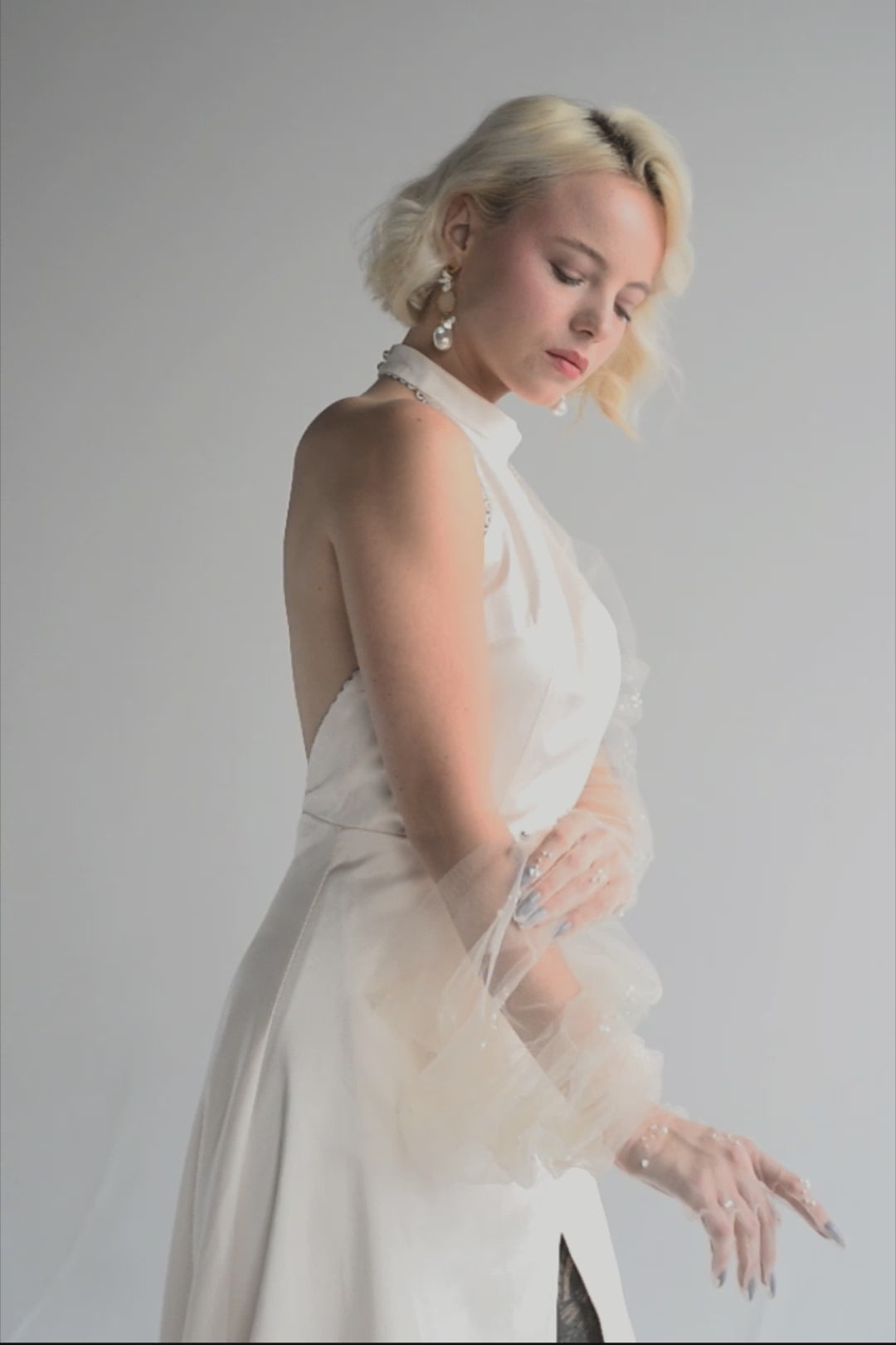 As you slip your hands into the gloves, each button becomes a connection to the goddess's ethereal realm. The champagne tulle cascades gracefully, creating a seamless extension of the gown's simplicity, and the ivory beading adds a touch of celestial sparkle to your fingertips.