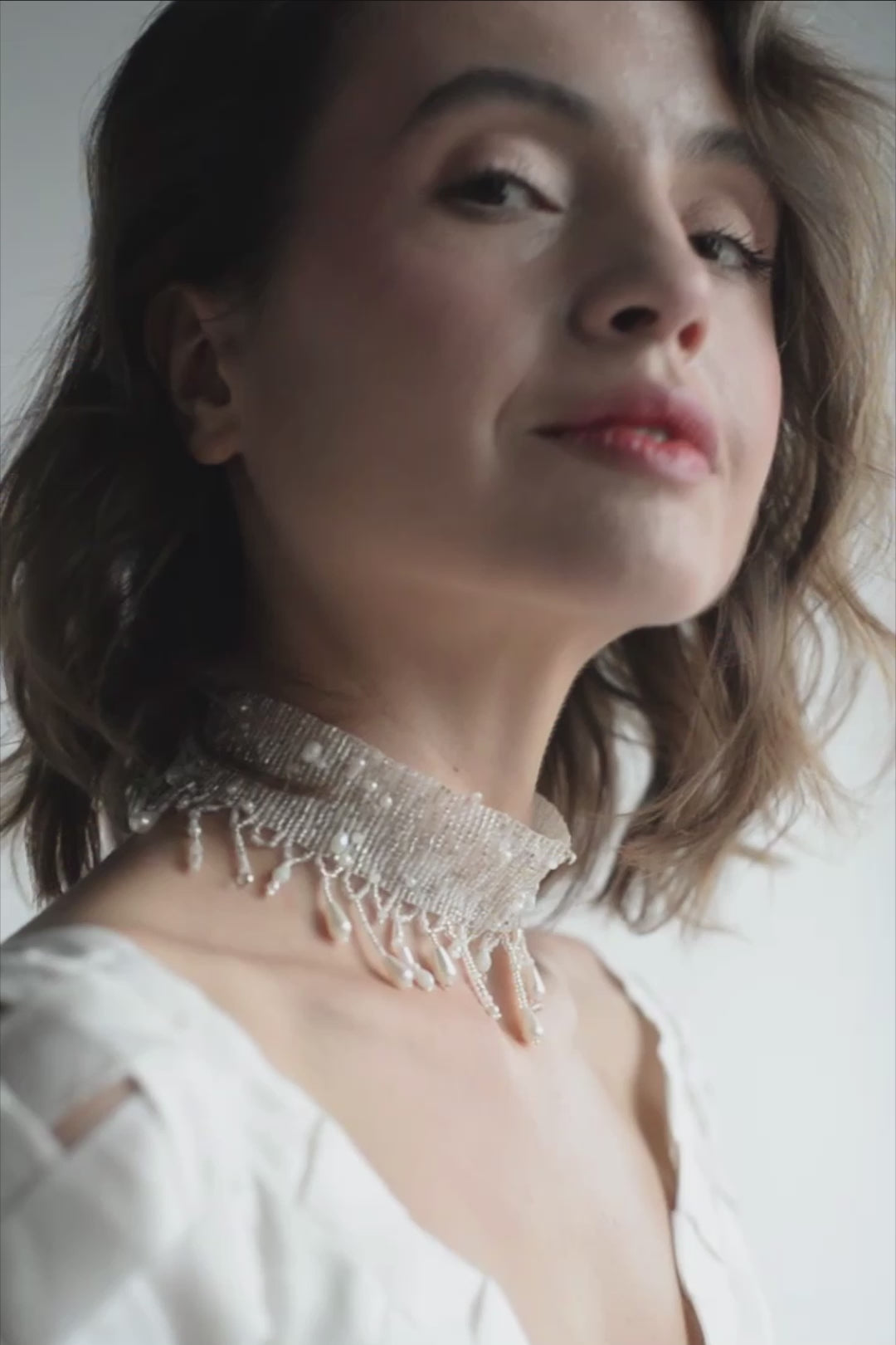 Elevate the Nieve dress with a bead necklace inspired by the gerdan ( ukrainian national necklace) style, delicately framing your neckline. This rectangular-shaped accessory, adorned with beads reminiscent of celestial constellations, enhances the gown's whimsical design. Each bead reflects the sparkle of starlight, harmonizing with the dress and adding a touch of heavenly beauty inspired by the goddess Nieve to your bridal look.