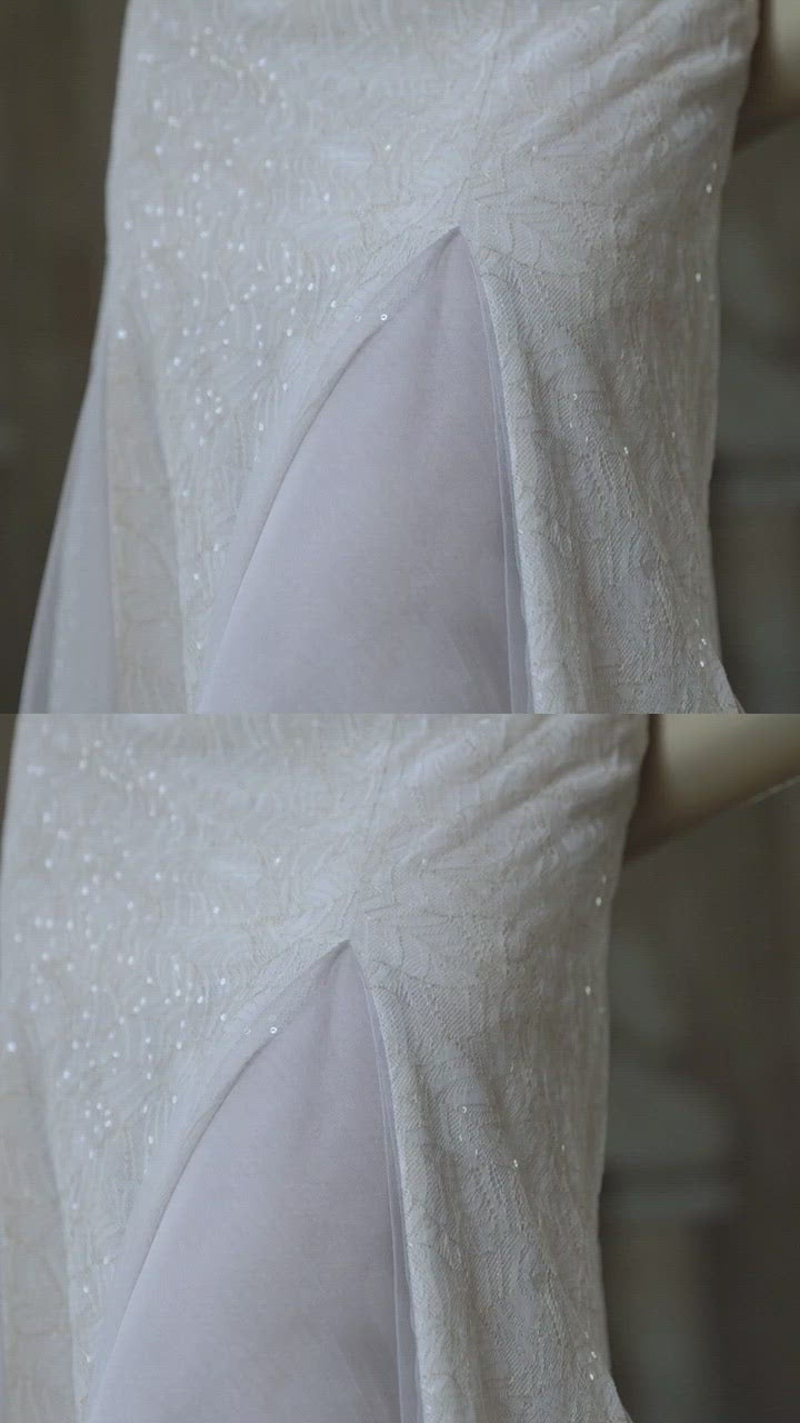 With an off-the-shoulder neckline and a subtle shine of tiny paillettes all over the dress, this beige lace gown is a romantic bride’s dream come true. A delicate wrinkled tulle frames the top of the long-sleeved bodice, creating a tandem with minimalistic waistline beading. The charming trumpet skirt pairs the beige lace tails with white semi-sheer silk crash chiffon inserts to add a gentle hint of sexiness by showing the bride`s legs.